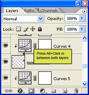 When the Curves box opens, input the following. Press Alt+left click in between the 2 layer’s (Mountain1 layer and Curves) to make a mask.