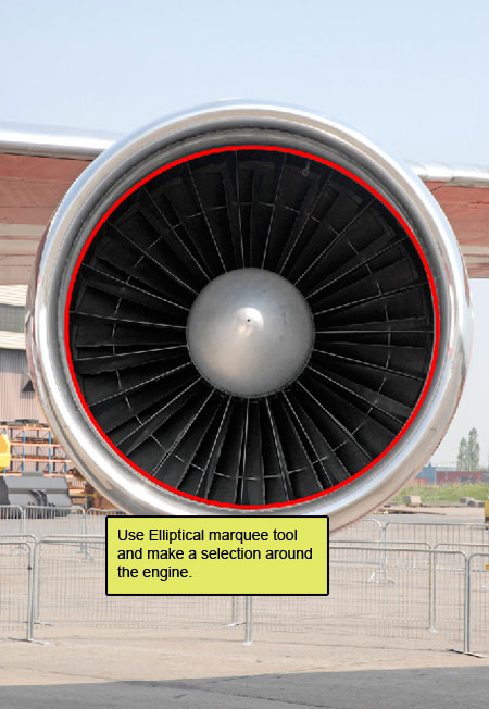 Click the engine-moteur and select the Elliptical Marquee tool, and then make a selection around the engine, then click V to activate the Move Tool. Left-click the image and drag the image to the main canvas and change the layer name to “engine”.