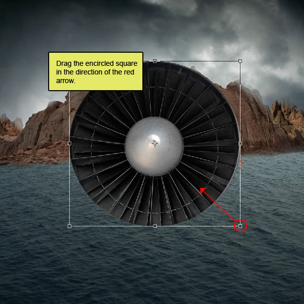 Next, activate the Transform tool (Ctrl/Cmd +T), then while the “Engine” layer is selected, resize it as shown below: