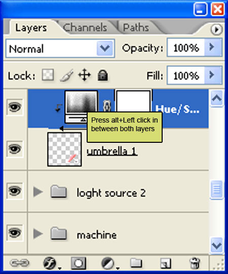 Press Alt+left click in between the 2 layer’s (umbrella1 layer and Hue/Saturation) to make a mask.