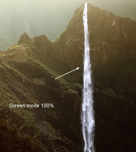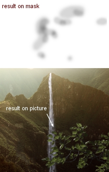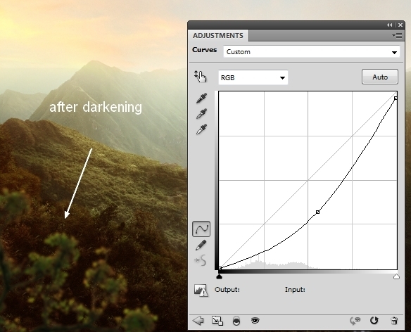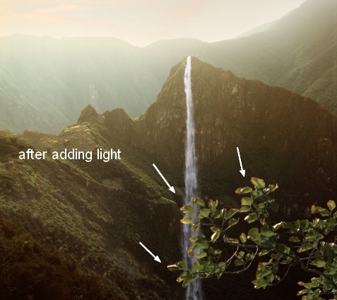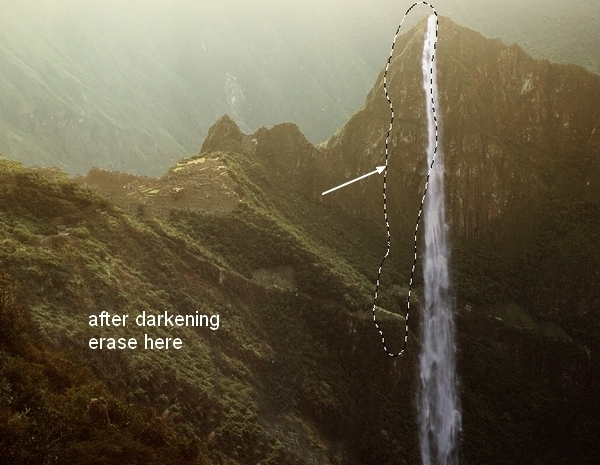On Curves layer mask use soft black brush to erase the top left of the waterfall to match the lightness with the scene:
