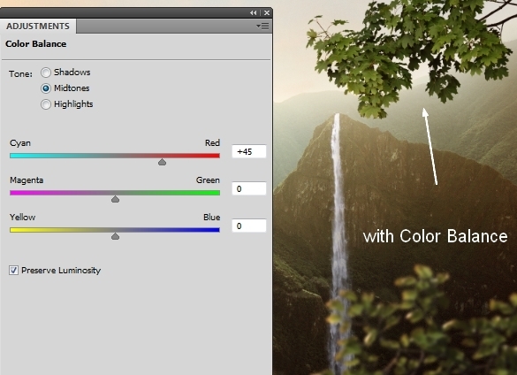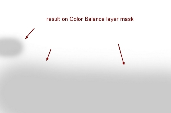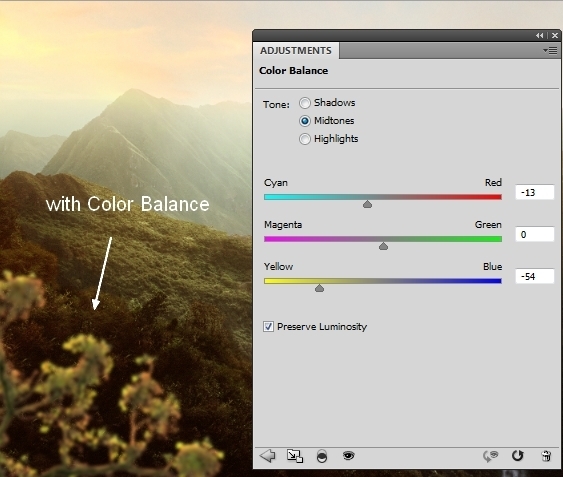 Active Brush Tool (B). On Color Balance layer mask use soft black brush with very low opacity (10-15%) to erase lower part and small part at the left of the scene. You can see how I did it on layer mask and result on picture: