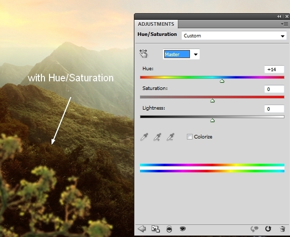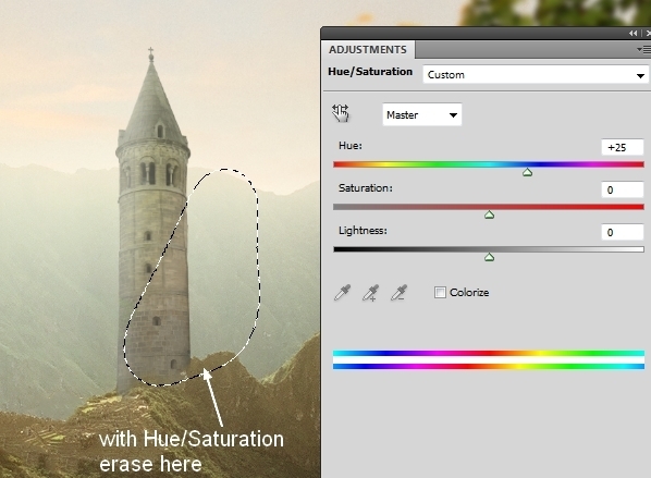 I used Hue/Saturation to change color of the tower. On Hue/Saturation layer mask erase the lower part of it: