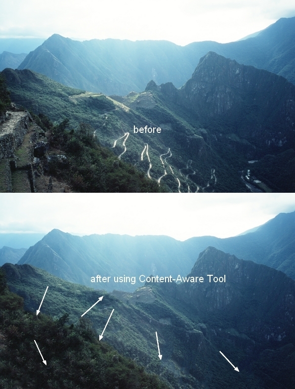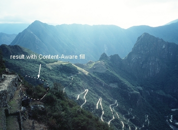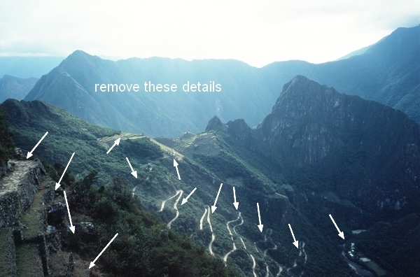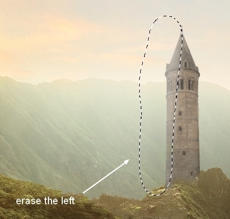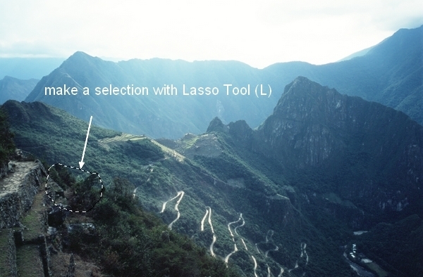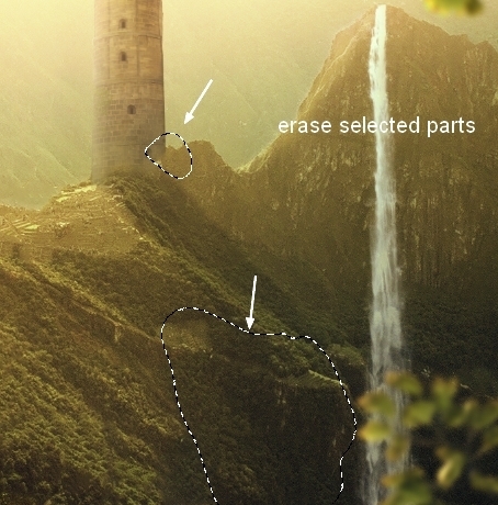 In this step we’ll remove some details of the landscape at foreground and lower areas. On this layer, use Lasso Tool to make a selection for one of indicated areas as shown below: