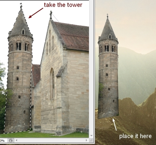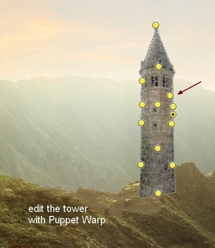 Go to Edit > Puppet Warp to edit the tower a little: