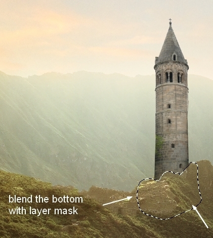 Add layer mask to this layer and use brush to blend the bottom of the tower with the ground: