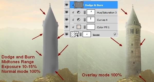 Take Dodge and Burn Tool with Midtones Range, Exposure about 10-15% to retouch light and shadow of the tower. You can see how I did it on layer mask and result on picture: