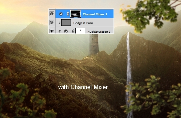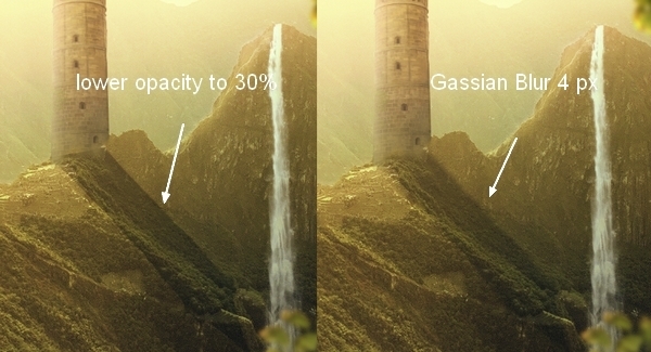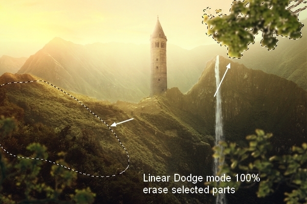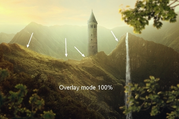Create a new layer with same settings in step 30 but uncheck Clipping Mask option. Use Dodge Tool to make some stronger light for the grass ground and the mountain: