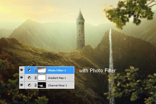 Make a Photo Filter layer to add some green to the scene: