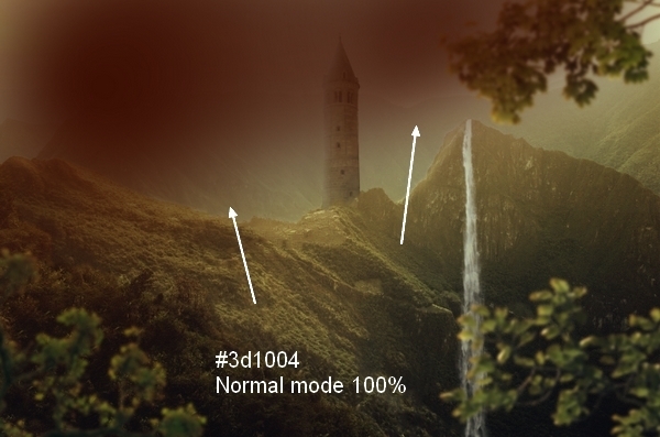 I created a new layer on the top, use brush with color #3d1004 to paint on the top of the pic. Then I changed the mode to Linear Dodge mode 100% and used layer mask to remove this effect on the top leaves and ground: