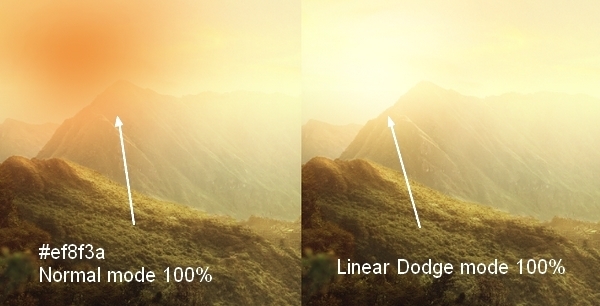 Make a new layer and I used brush with color #ef8f3a to paint on the top left of the pic (sun part). Set the mode to Linear Dodge 100%: