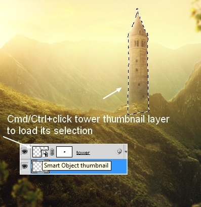 Final step: Make a new layer under the tower one. Hold Cmd/Ctrl and click the tower thumbnail layer to load its selection: