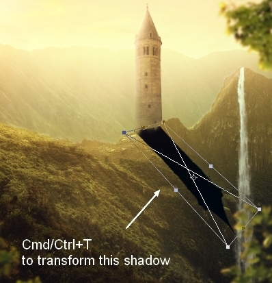 Fill this selection with black (Edit >Fill or Shift+F5). Flip this shadow vertically (Edit > Transform > Flip Vertical) and place it under the tower bottom. Use Cmd/Ctrl+T to transform this shadow as shown below: