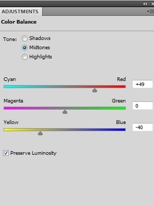 I used an adjustment layer to add some red to the scene. On landscape layer, go to Layer > New Adjustment Layer > Color Balance: