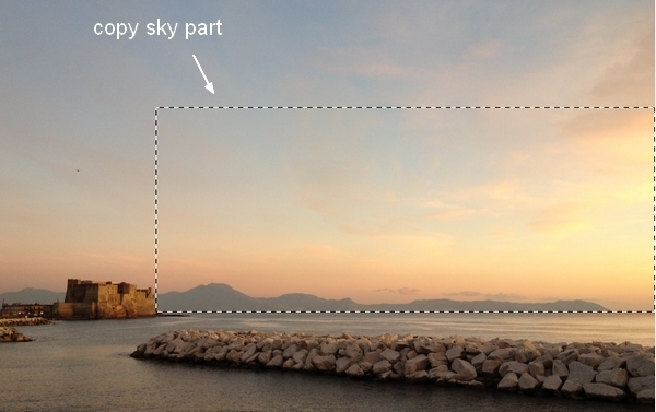 Open sky stock. Use Retangular Marquee Tool to choose sky part then place it at the top of our main picture. Go to Edit > Transform > Flip Horizontal:
