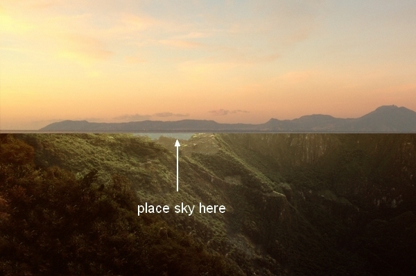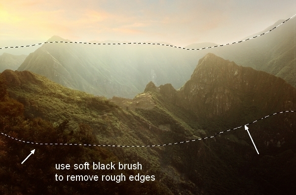 Click the second button at the bottom of Layer Pallete to add mask to this layer. Use soft black brush to remove rough edges of the sky and blend it with the scene: