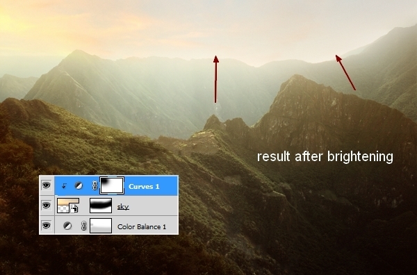 I used an adjustment layer with Clipping Mask to brighten the sky. Go to Layer > New Adjustment Layer > Curves: