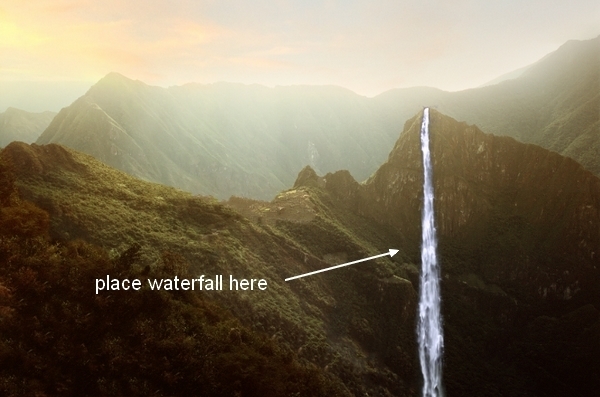 Extract waterfall from original stock and position it at the top of the right mountain: