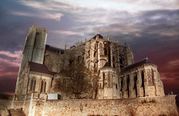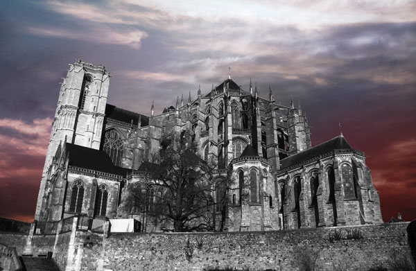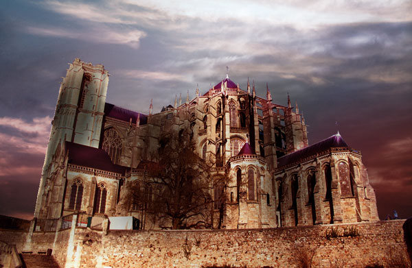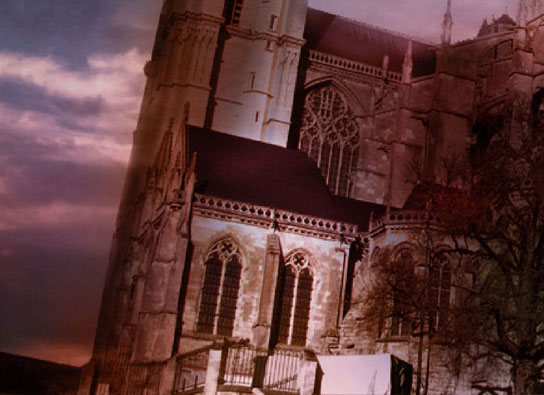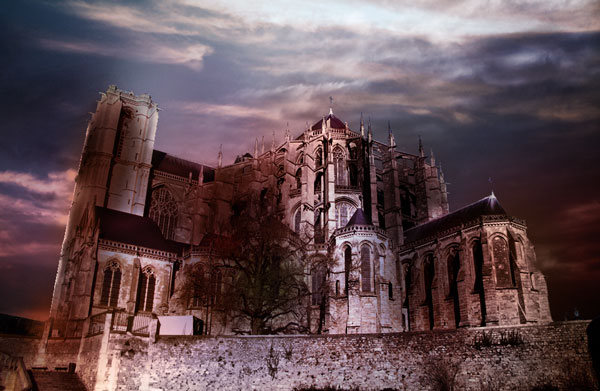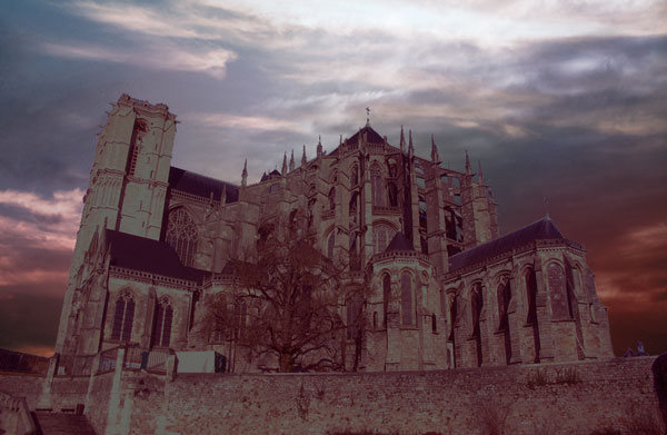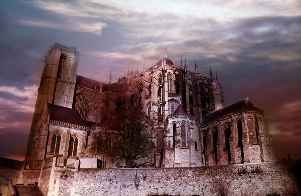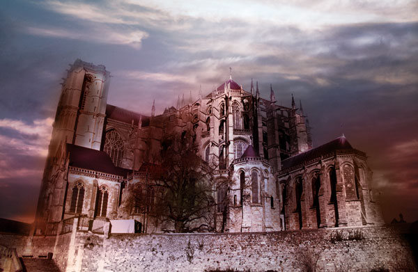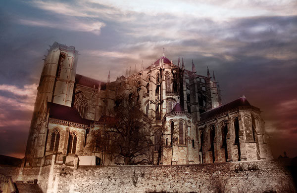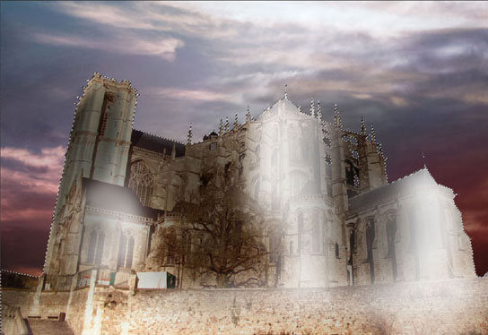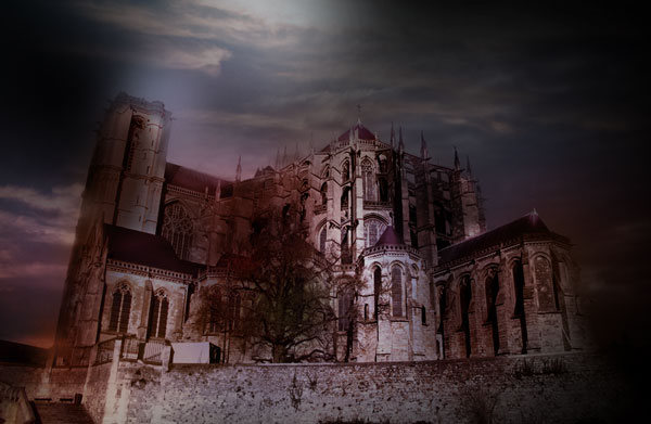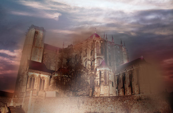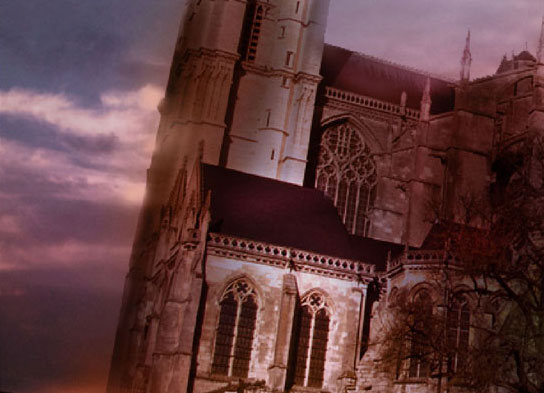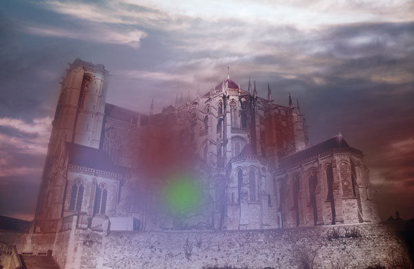 There is only one detail left. If we look on the edges of the cathedral, we can notice that the main source of light is situated behind the cathedral, so the rays that come through the clouds should light the walls of the cathedral partially.