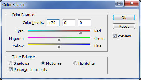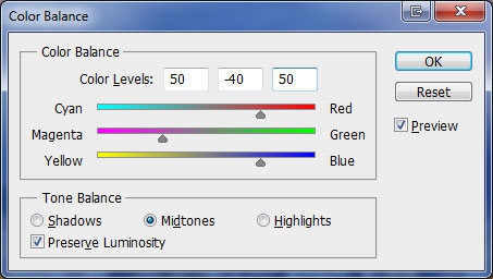 Apply Image > Adjustments > Color Balance with the following adjustments: