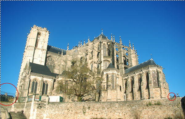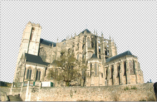 The whole cathedral became sharper, but we should put emphasis only on some of its parts, in order to make the cathedral look more three-dimensional. Therefore we select the Eraser Tool and soft-edged brush, 200 px in diameter and partially delete this layer along the edge of the cathedral on the left and on the right, erase the cathedral fragment with the tree and leave only the central outstanding part of the cathedral.