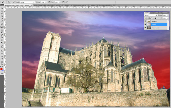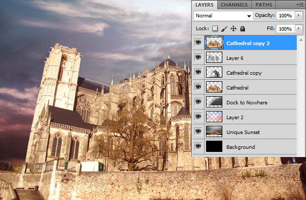The cathedral seems to be separated from the sky, we should remove this drawback. To begin with let’s admit, that cathedral is reddish, it’s a warm color, and there’s cold blue color in the sky. Let’s add some cold tone to the image of the cathedral. As the sky is the majority carrier of color, in contrast to it the cathedral should not be too many-colored, so let’s avoid bright colors, just play with tones a little. Copy the layer with the cathedral and place it above all the layers.