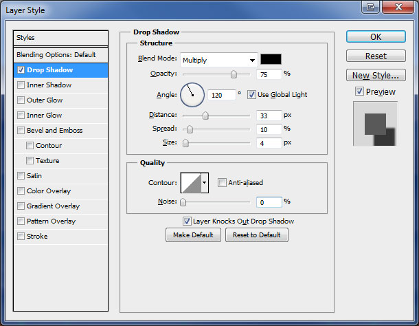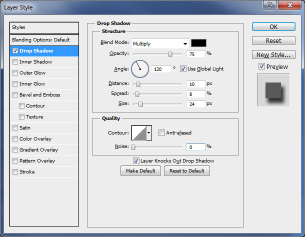 Apply Drop Shadow by going to Layer > Layer Style > Drop Shadow.
