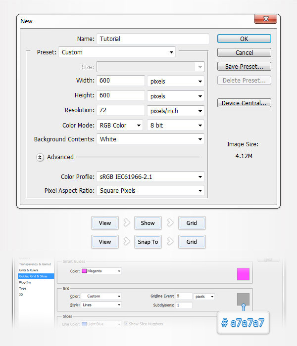 Open Photoshop and hit Control + N to create a new document. Enter all the data shown in the following image and click OK. Enable the Grid (View > Show > Grid) and the Snap to Grid (View > Snap To > Grid). For starters you will need a grid every 5px, so simply go to Edit > Preferences > Guides, Grid & Slices and focus on the Grid section. Enter 5 in the Gridline Every box and 1 in the Subdivision box. Also, set the color of the grid to #a7a7a7.