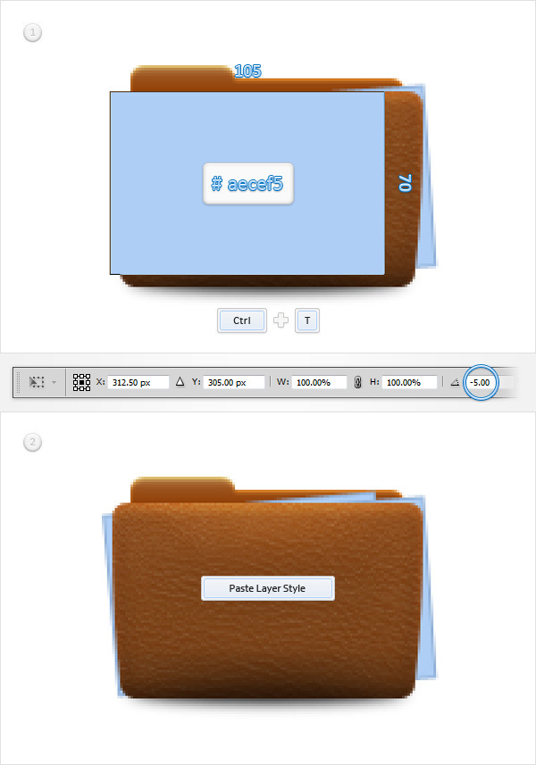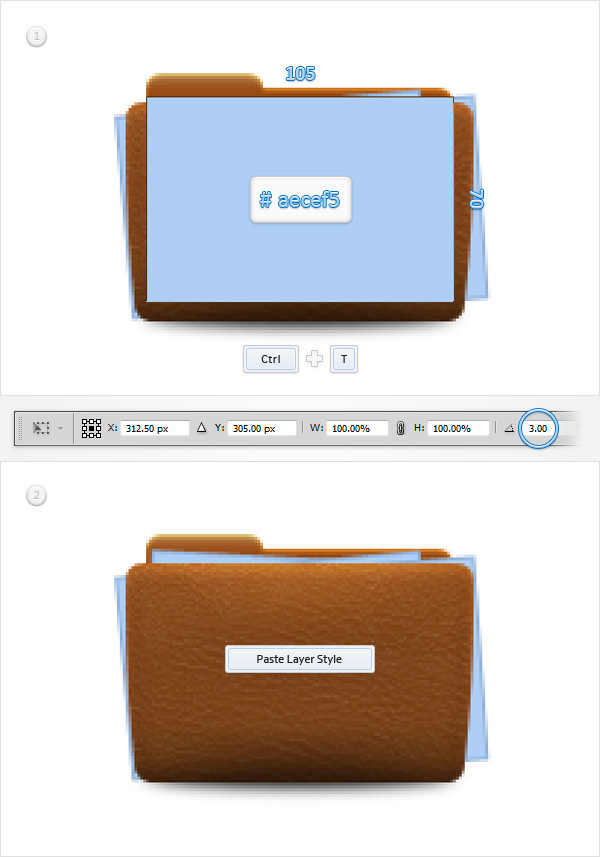Set the foreground color at #aecef5, pick the Rectangle Tool, create a 105 x 70px vector shape and place it as shown in the first image. Make sure that this blue rectangle is selected and hit CTRL + T (or go to Edit > Transform > Rotate). Focus on the top bar, set the rotation angle at -4 degrees and hit Enter.