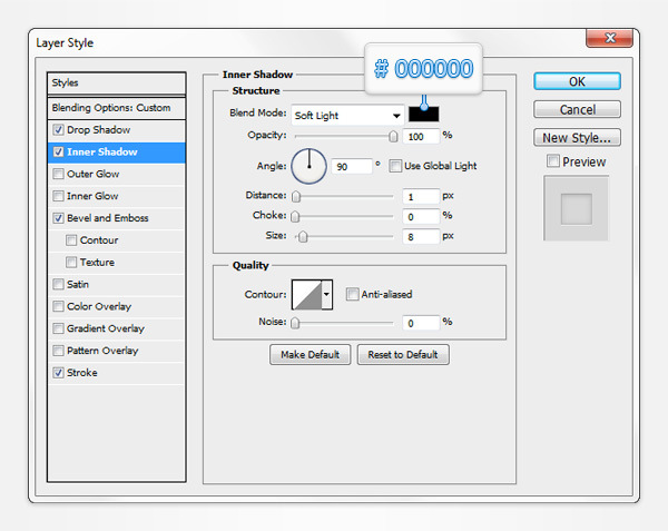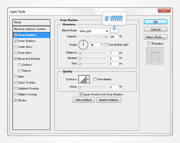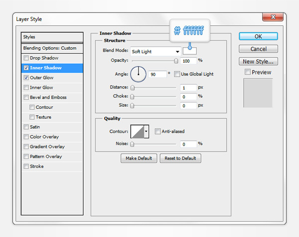 Make sure that this copy stays selected, lower the Fill to 0% then open the Layer Style window and enter the properties shown in the following images.