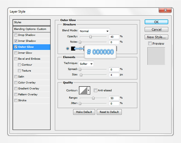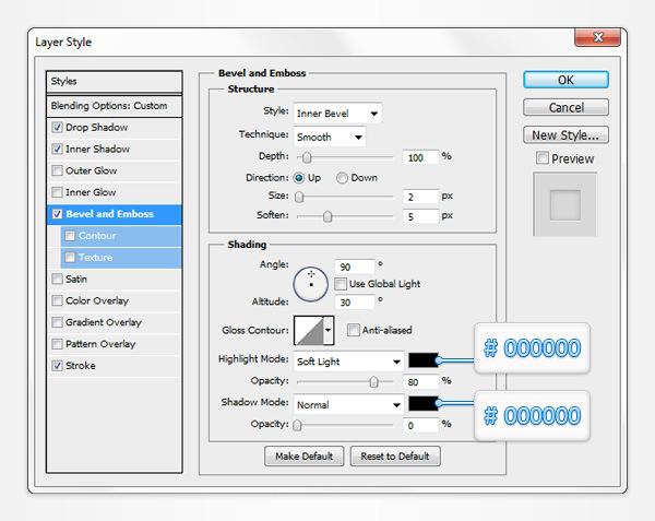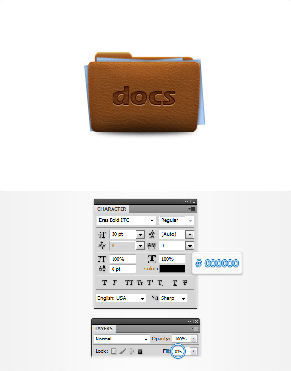 Using the Horizontal Type Tool add a simple piece of text as shown in the first image. Use the Eras Bold ITC font with the size set at 30pt and pick a random color. Make sure that your piece of text is selected, lower its Fill to 0% then open the Layer Style window and enter the properties shown in the following images.