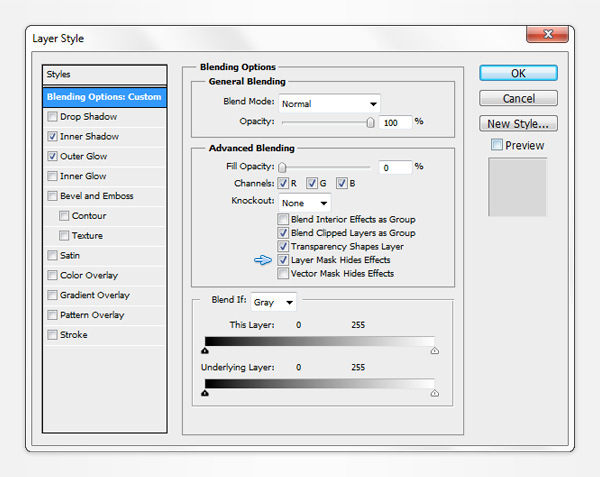 Open the Layers Style window for this masked vector shape and simply check the Layer Mask Hidden Effects box. Finally, hit CTRL + D to get rid of that selection.