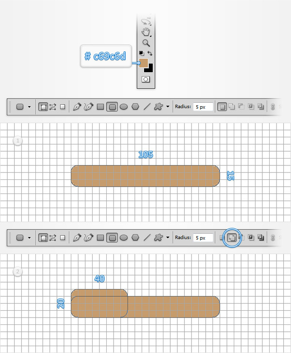 Set the foreground color at #c69c6d and pick the Rounded Rectangle Tool. Focus on the top bar, set the radius at 5px and create a 105 x 15px vector shape. Make sure that this new shape stays selected and get back to the top bar. Check the Add button then simply add a 40 x 20px rounded rectangle and place it as shown in the second image.