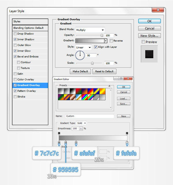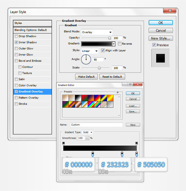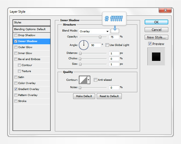 Move to the Layers panel (Window > Layers), name the existing vector shape "back" then double click on it to open the Layer Style window. Activate the Inner Shadow and the Gradient Overlay then enter the properties shown in the following images.