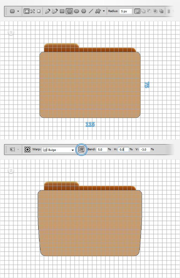 Make sure that the foreground color is still set at #c69c6d and grab the Rounded Rectangle Tool. Create a 115 x 75px vector shape, place it as shown in the first image and go to Edit > Transform > Warp. Focus on the top bar, select Bulge from the Warp drop-down menu, check the Orientation button, enter 5 in the Bend box, set the Vertical distortion (V:) at -3% then hit Enter.
