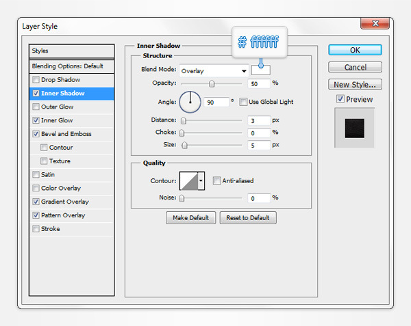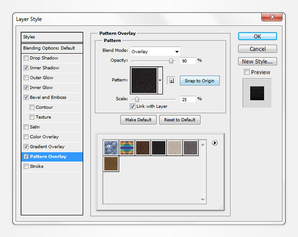 Open the Layer Style window for your "front" vector shape and enter the properties shown in the following images. For the Pattern Overlay section you will need the darkest pattern from Neutral Tileable Leather Patterns pack.