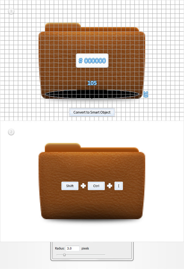 Make sure that the Ellipse Tool is still active, create a 105 x 10px vector shape, place it as shown in the first image and move to the Layers panel. Convert this new vector shape into a smart object, send it to back (Shift + CTRL + [ ) and go to Filter > Blur > Gaussian Blur. Enter a 3px radius and click OK.