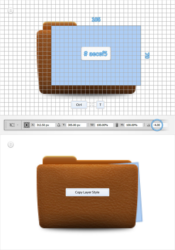 For the following steps you will need a grid every 1px, so simply go to Edit > Preferences > Guides, Grid & Slices and enter 1 in the Gridline Every box. Using the Rectangle Tool, create a 105 x 70px shape, place it as shown in the first image and hit CTRL + T. Set the rotation angle at -5 degrees and hit Enter.