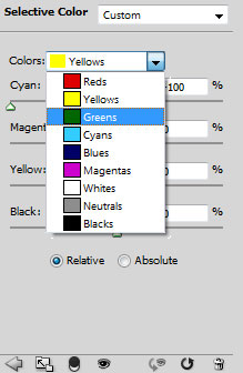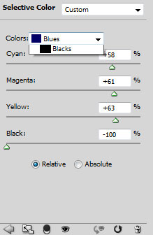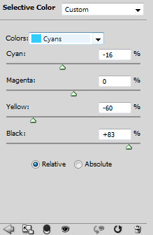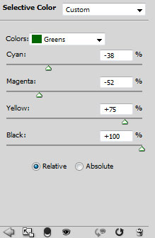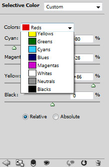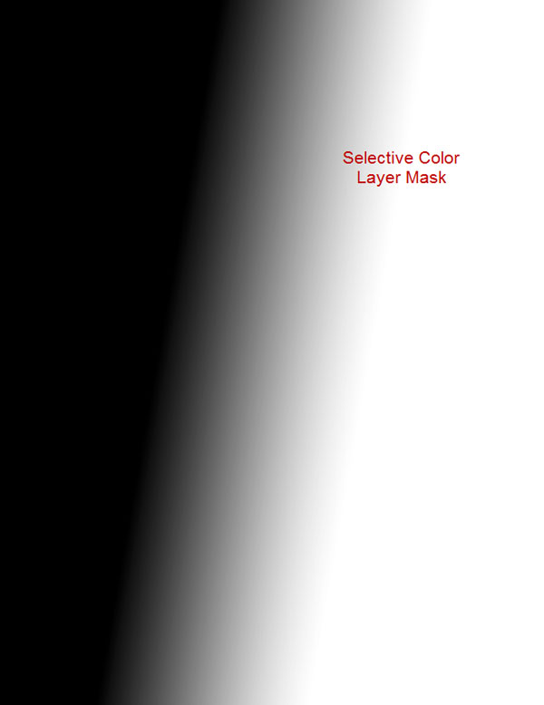 Now it’s time for a Selective Color Adjustment layer. Use the settings shown below (or try out the sliders yourselves) and in the layer mask drag with the Linear Gradient Tool to achieve something like in the image below.
