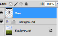 First add a layer mask to the “Man” layer. With a round soft black brush paint closely around his shoes but do not overlap them. Select the Smudge tool and set it’s strength to 90%. In the layer mask drag from the black outline you just made towards his shoes. This is simpler to do than say so give it a shot, you’ll know what I mean.