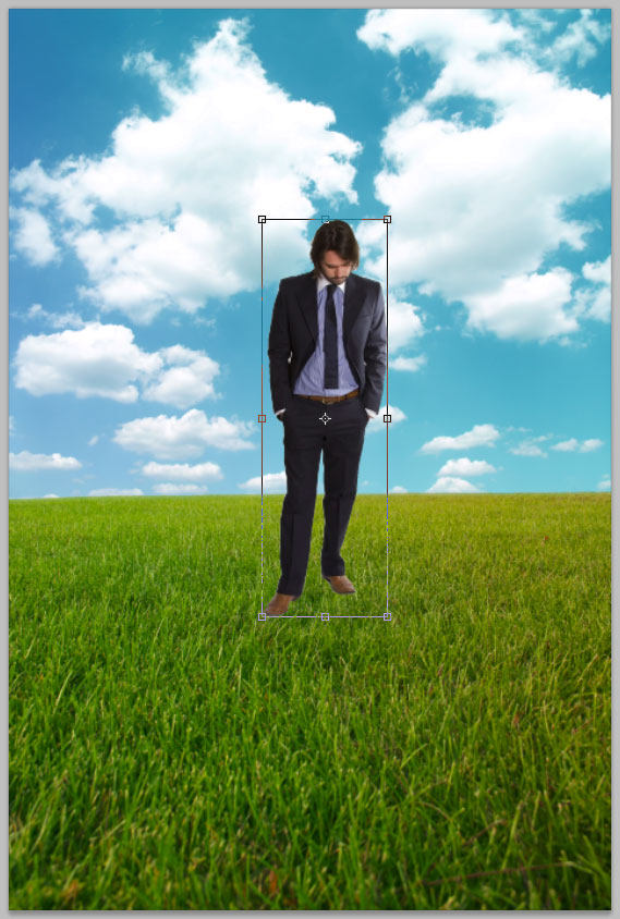 Open file “Man” and using the Quick Selection tool make a selection of the white background. It should be very easy because it is a uniform white. Press Ctrl + Shift + I to invert the selection and thus select the man and copy selection (Ctrl + C). Paste it into our document and Free Transform as shown below.