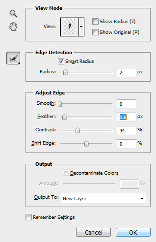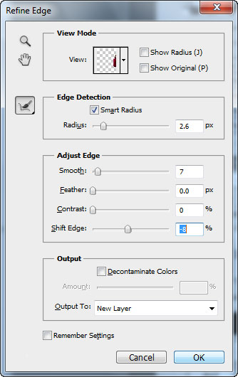 Ctrl-click this layer to load it as a selection and press Ctrl + Alt + R to open the Refine Selection window. Use the settings shown below and after you press OK delete the unselected layer and name the new layer “Man”.