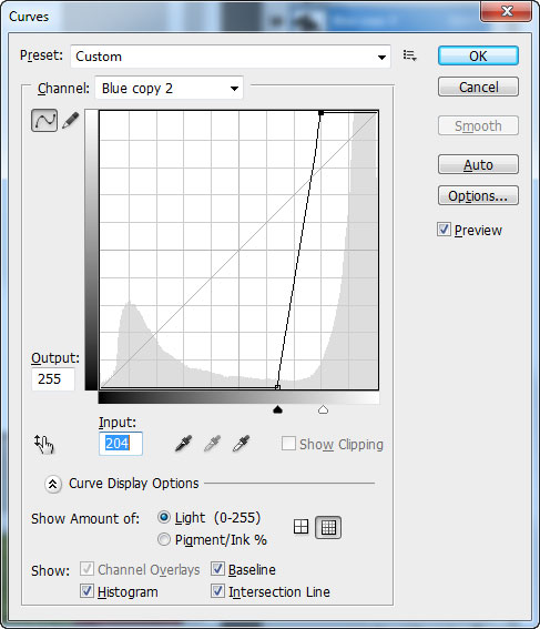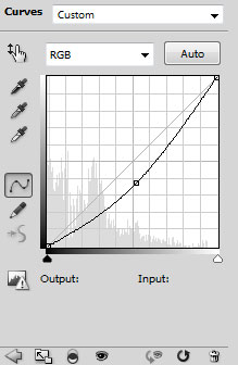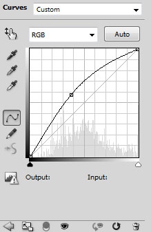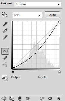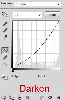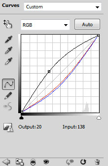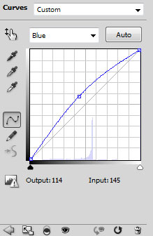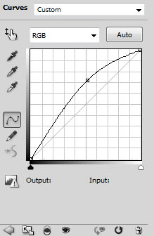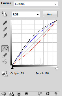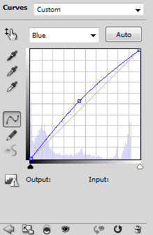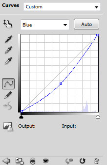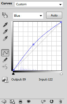 Add a Curves Adjustment Layer and in the Blue Channel drag the curve upwards to increase the blues in the light areas. Add another Curves Adjustment Layer but this time drag the RGB curve downards and fill the layer mask with black (if you don’t know how to fill a layer mask with black reffer to step 6). Because the light is coming from the left of the woman (we are using the viewer perspective) brush with a round soft white brush at 80% the right side.