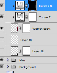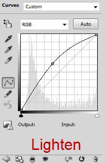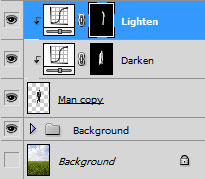 Add yet another Curves Adjustment Layer and clip it to the below curves layer (and consequentally to the man layer) but this time drag the curve upwards to lighten. Fill the layer mask with black and paint with the same round soft brush at 80% paint the right side of the man carefully.