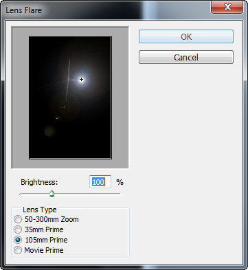 Time to add the light. In this step I will teach you a little trick to make a lens flare and move it freely on the screen. Make a new layer (Ctrl + Shift + Alt + N) and fill it with black (press Shift + F5 and select black from the drop down menu). Choose Filter > Render > Lens Flare and use the settings shown below.