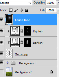 Change the screen mode to Screen and voila, the black disappears, leaving you with a movable lens flare. Place the render flare just above the man’s right shoulder (from the viewer perspective).