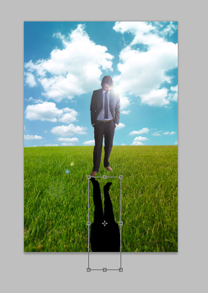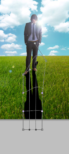 Make a new layer (Ctrl + Shift + Alt + N) and move it below the “Man” layer. Ctrl-click the man layer to load it as a selection and in the newly created layer press Alt + Backspace to fill the selection with black (make sure you have black as foreground color). Press Ctrl + T and transform the selection like in the image below. Right click on the shadow an select Warp. Adjust it like shown below to place the shadow properly on the ground and press Enter.