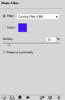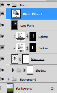 To integrate the man with the surrounding environment choose Layer > New Adjustment Layer > Photo Filter and select a cooling filter. Select all the layers and groups above the “Background” group and group them (Ctrl + G). Name this group “Man”.