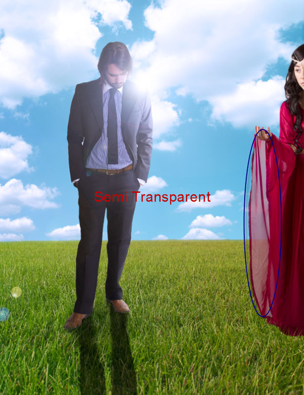 Add a layer mask (Layer > Layer Mask > Reveal All) and with a 10% round soft black brush paint over the semi-transparent part of her dress. Then repeat the trick we used at step 11 to add blades of grass (by drawing a black line around the edges and smudge).