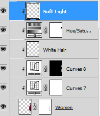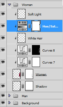 In the next steps we will be adding clipped layers to the layer “Woman” and I won’t repeat at each step. To clip a top layer to a bottom layer simply Alt-click in between the two layers.